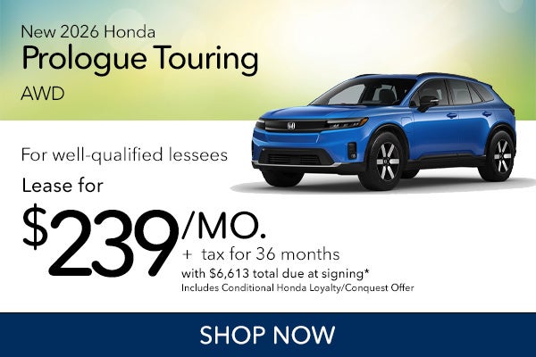 *Lease a New 2026 Honda Prologue Touring AWD for $239/mo (STOCK# HL12807, MSRP $48,950) Well-qualified lessees may lease through Honda Financial Services for $239/mo for 36 months with $6,613 total due at signing (includes $4,995 cash/trade down payment, first monthly payment, bank acquisition fee, $784 doc & title prep fees, $0 security deposit). Sales tax, title, reg/license fees additional. Includes $2,000 Honda Loyalty/Conquest Offer toward Cap Cost Reduction or Down Payment Assistance when leasing through Honda Financial Services for current owners of any 2011 or newer Honda, Chevrolet, Ford, GMC, Hyundai, Jeep, Kia, Mazda, Nissan, RAM, Subaru, Tesla, Toyota, or Volkswagen vehicle. Must provide proof of ownership of eligible vehicle in the form of a current vehicle registration or proof of valid auto insurance. No trade-in required. Offer excludes purchases made prior to the program period and is transferable among members of the same household when the retail delivery registration address matches the current address of the proof of ownership document. Closed end lease. 10,000 miles/year. Lease end buy option $25,454. All incentives to dealer, cannot be combined with other offers. Take delivery by 4/30/2026.